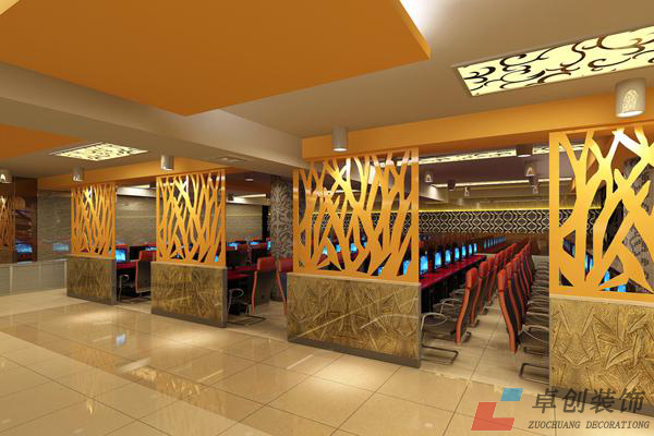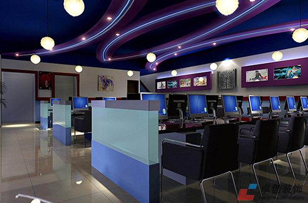 網(wǎng)吧的墻面宜采用較為樸素的設(shè)計或者素色的造型設(shè)計,以便突出經(jīng)營的主體——電腦設(shè)備。一些游戲廣告、食品飲料運營商對網(wǎng)吧裝修的介入,不僅可以節(jié)約墻面裝飾的費用還能給業(yè)主一些額外的實惠,所以如果能找到一些貼近網(wǎng)吧主題的游戲廣告做成整幅的墻面噴繪也是一種不錯的選擇。但切記不應(yīng)為了裝飾而裝飾,不應(yīng)貪圖廣告小利,按納不合時宜的廣告而破壞了裝修的整體效果。