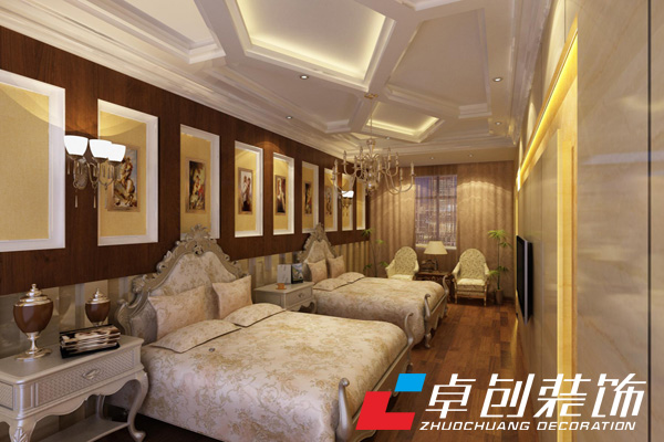 3、鋪板材:一般在歐式酒店裝修過程中,其室內(nèi)墻面整體都鋪上基層板材,外面貼上裝飾面板,整體效果雍容華貴,但會(huì)使房間顯得擁擠。還有一種,雖是用密度板等板材整面鋪墻,但上面再刷上白色乳膠漆,從外表上看不出是用板材裝修的,它是利用密度板切割方便、邊緣整齊平直的特點(diǎn),通過板材的拼接來做直線、坑槽等造型,這樣處理的墻面既平整、造型細(xì)致,又避免了大量使用板材而帶來的擁擠感。