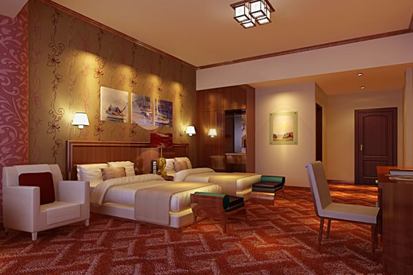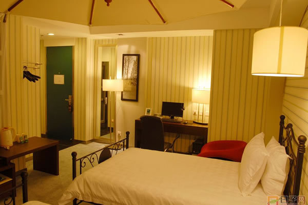 客人使用客房是從客房大門處開始的,一定要牢記這一點,公共走廊宜在照明上重點關照客房門(目的性照明)。門框及門邊墻的陽角是容易損壞的部位,設計上需考慮保護,鋼制門框應該是個好辦法,不變形,耐撞擊,另外,房門的設計應著重表現,與房內的木制家具或色彩等設計語言互通有關,門扇的寬度以880-900mm為宜,如果無法達到,那么在設計家具時一定要把握尺度。