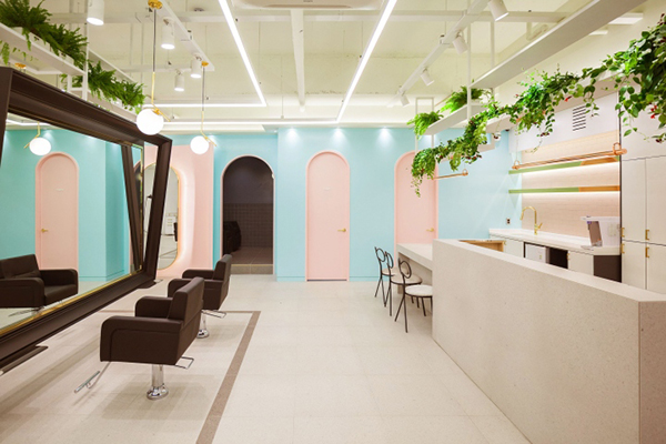 合肥卓創裝飾公司推薦的這組案例可以說是非常具備女生喜愛的元素,跟以往的傳統風格,復古風格有很大反差,整體空間洋溢著青春和甜美的氣息。誰說美發店不可以走甜美風,這是一個創造美的地方,一件美好的事情也在這里發生。理發店裝修設計白色和黑色應該是較為常用的整體顏色了,深色的美發鏡主要呈現炫酷風格,而白色頂面在搭配是較為簡單的,配合純度和明度高的糖果色,裝飾色彩更和諧,而在夜晚的時候打上燈光是相當好看的,讓美發店的空間顯得特別的干凈。讓客戶更加放松,會讓人看起來更舒服,也能緩解消費者緊張的心情,放松的去享受美發師帶來的服務。