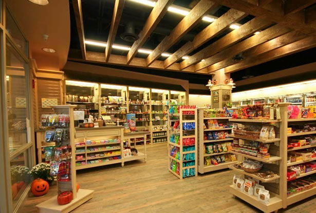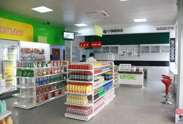 便利店的裝潢效果應該最有效地突出商品的特色。裝潢不宜采用豐富、鮮艷的色彩,不要讓裝潢的色調來分散顧客對商品的視覺注意力,最好是天、地、墻都采用反光性、襯托性強的純白色。而且純白色給人的感覺就是整潔、干凈,同時天、地、墻統一色調,會給人造成較大空間的視覺偏差。便利店對店鋪層高的要求一般在3 米以上,但由于所選擇的店面多數處于底層,天花板下多數有下水管、電線管、消防管等管道,這時不要安裝吊頂天棚將這些管道隔離,只要這些管道粉刷成純白色,并將光源置于管道之下即可,這樣既可以保證商店的空間,又可以節省費用。
